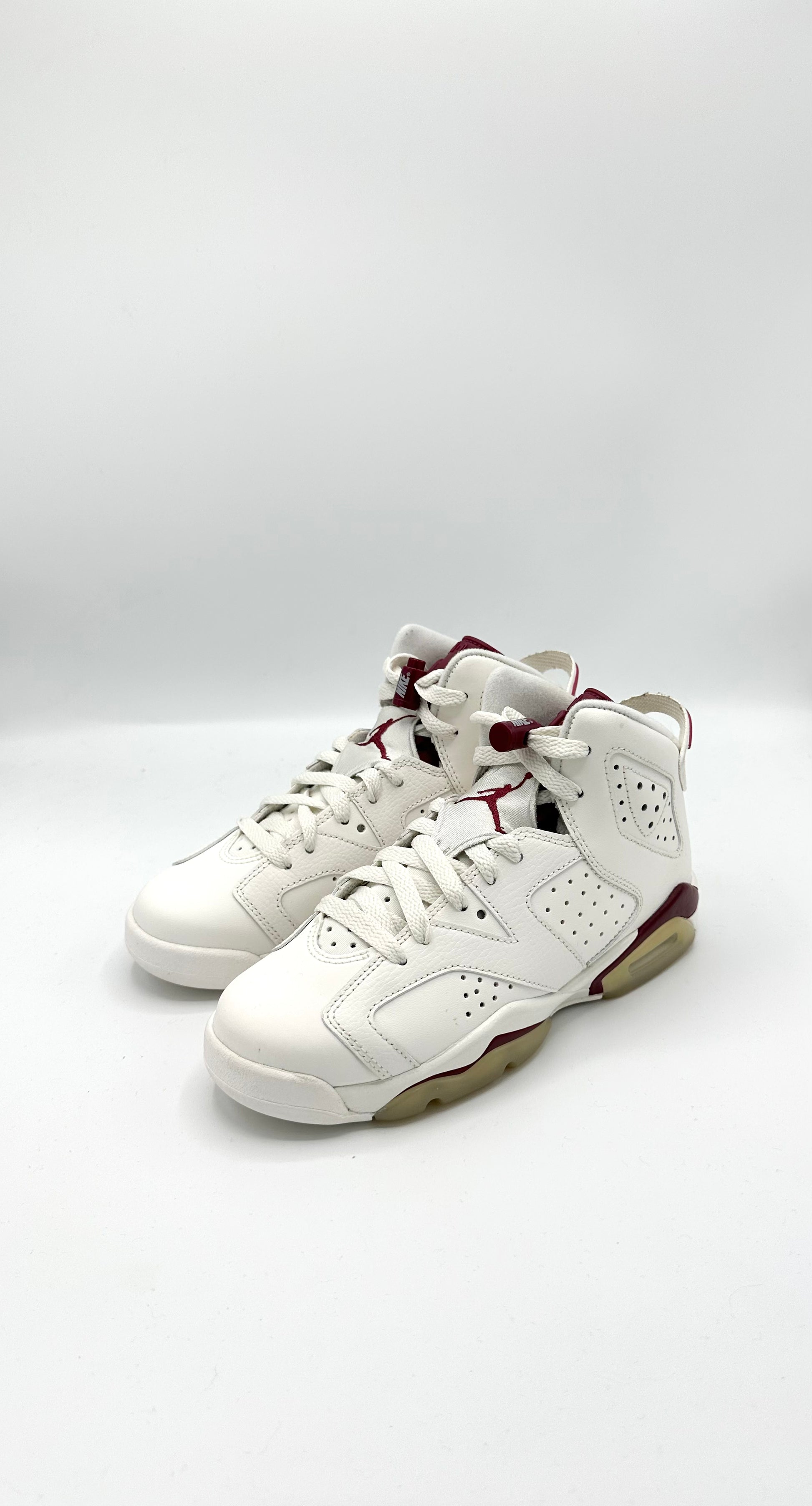 The Air Jordan 6 Retro OG BG sneaker is a timeless tribute to Michael Jordan's historic first championship victory in 1991. The December 2015 reissue presents a sophisticated Off-White leather upper, perfectly accentuated by Maroon Red details. Retaining its iconic high-top silhouette, the shoe incorporates ventilated lateral side panels and prominent Nike branding. Modern upgrades include a clear outsole and a TPU heel pull for effortless on-and-off functionality.